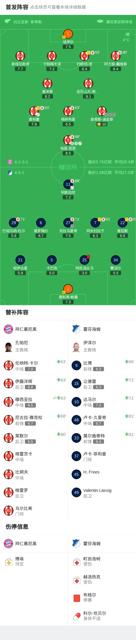 第20分钟,阿克波古马送红点套餐,凯恩命中,拜仁1-0霍芬海姆