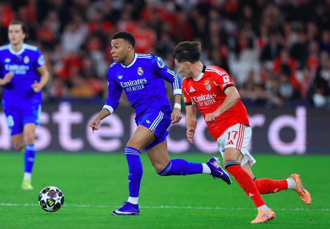 第25分钟,阿诺德的传中打穿本菲卡防线,姆巴佩拍马赶到,差一点就能够碰到皮球。