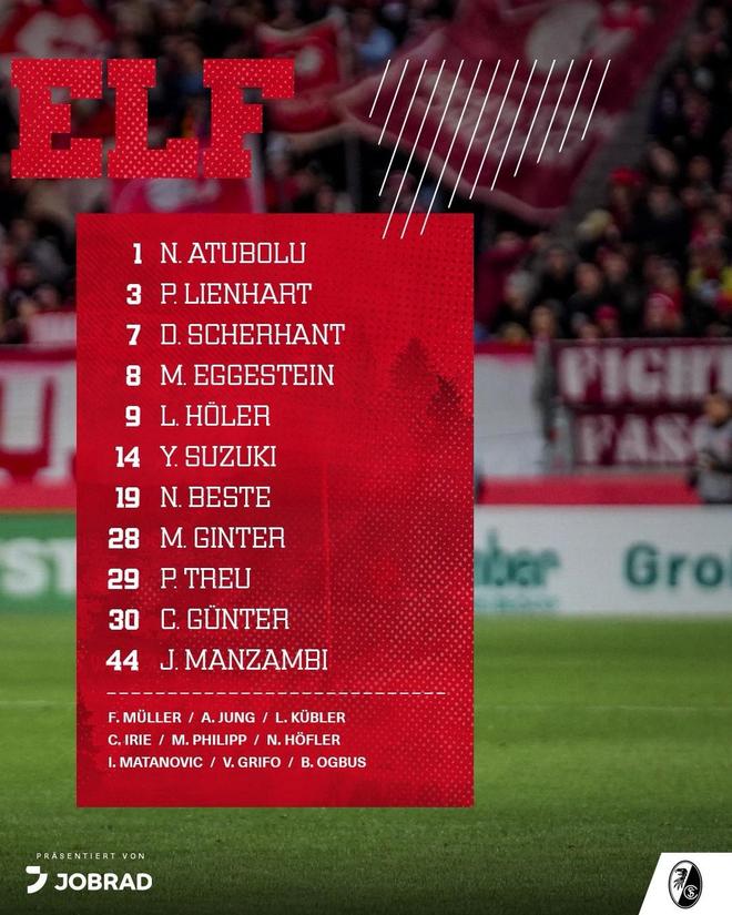 弗赖堡首发:1-阿图博卢、29-菲利普-特罗伊、28-金特尔、3-林哈特、30-京特尔、8-埃格施泰因、44-曼赞比、19-贝斯特、14-铃木唯人、7-舍尔汉特、9-霍勒