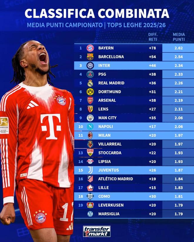 五大联赛场均积分榜:拜仁、巴萨、国米前3,阿森纳跌至第7